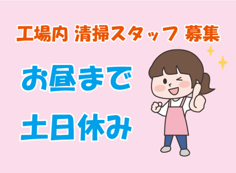 仕事内容 | 工場内の清掃 事務所、玄関、食堂、会議室などの清掃 タオル類の洗濯 湯呑み洗いなど |