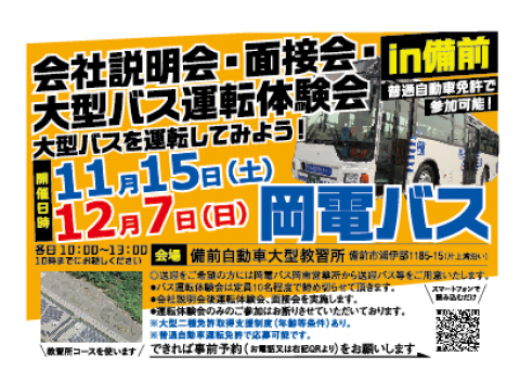 ※送迎を希望される方には岡電バス岡南営業所から備前会場までの送迎バス等をご用意いたします。